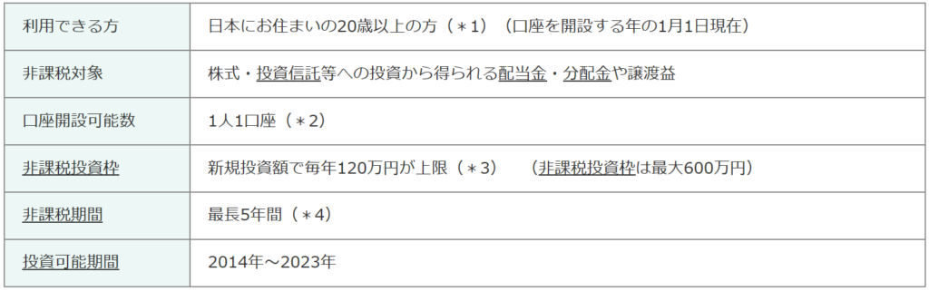 つまり、ふつうは株とかで設けた利益分に対して約20%の税金がかかるんだけど、NISA制度を使うと、儲けに対して税金が免除されるのよ! 例えば、株で100万円設けた!ってなっても実際は20万円税金で徴収されるから実質的な利益は80万円になっちゃうけど、NISA口座で100万円の利益が出たら、100万円丸々もらえるの!!税金ゼロよ、ゼロ! だけど、投資金額と税金免除の期間は定められた制限があることだけは注意ね。(下の表を参照してね♪)