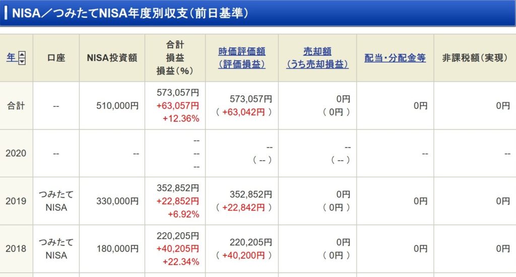 51万円の積立額に対して+6.3万円(+12.3%)の含み益!!!! 預金しても利子がほぼ0のこの時代、この利益はすごいわ!! (※記事を書いている時点でアメリカ株価指数が史上最高値近辺のタイミングだけど・・・。)