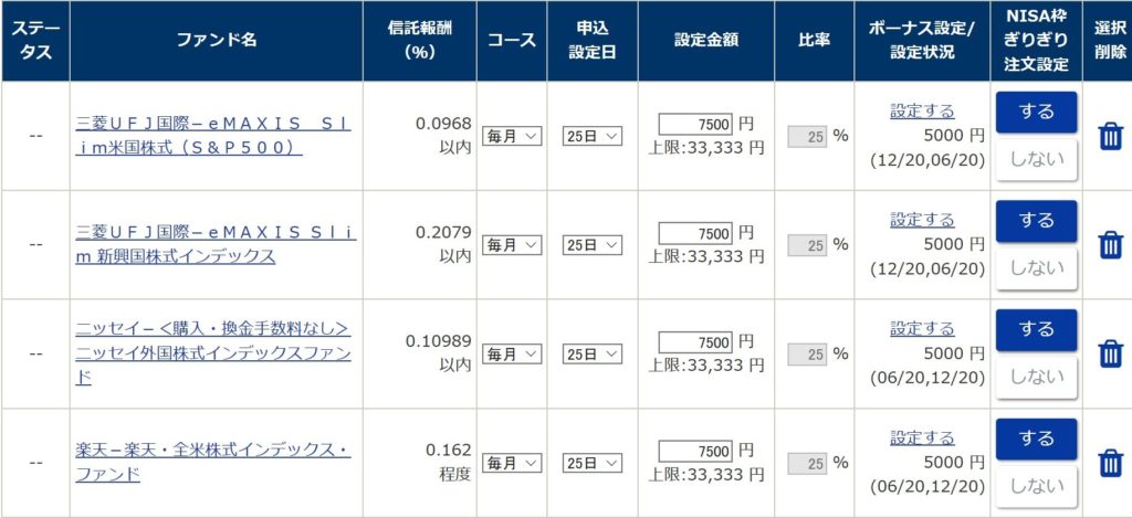 基本的にはアメリカのインデックス中心に投資をしているわ。日本は将来衰退すると思ってるから、日本のインデックスは投資対象から外してるの! 上記4つのファンドに毎月7,500円ずつ、合計3万円の積立ね。つい最近まで毎月5,000円ずつのボーナス月だけ増額してたんだけど、なるべく毎月均等に投資するように積立額を変更したの! 詳しく説明するのめんどくさい(笑)けど、毎月均等に積み立てていくほうが良いのよ!!(テキトー。)