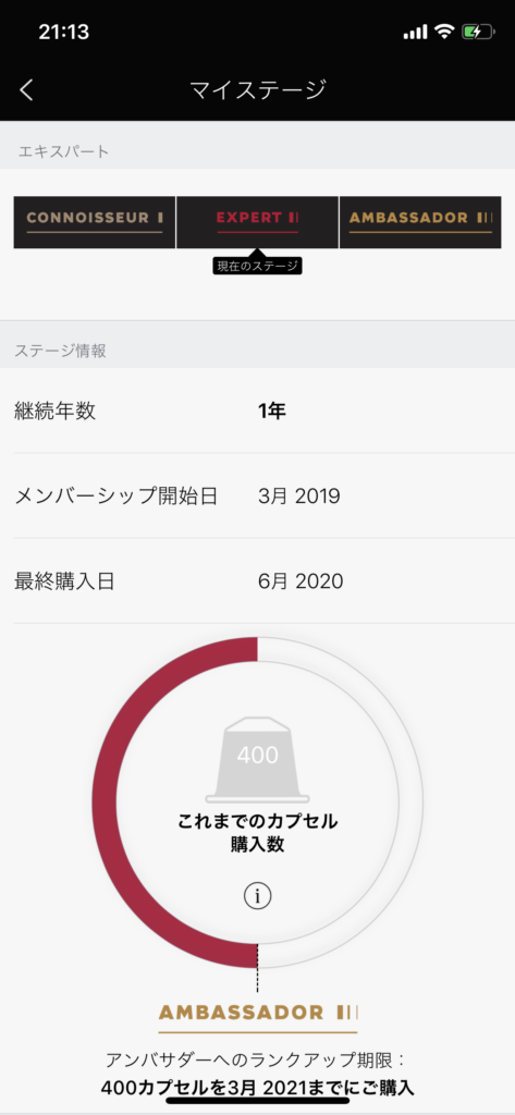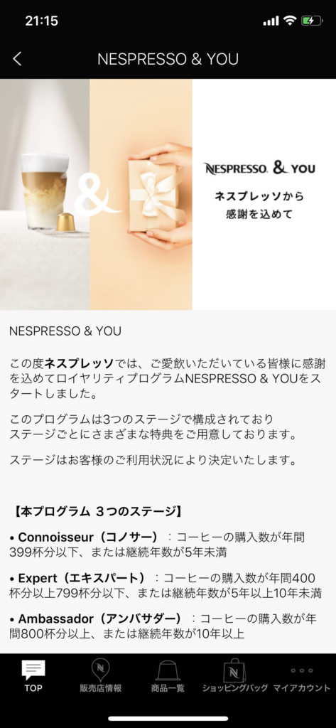 NESPRESSO &YOUは大きく下記の3つのステージがあって、年間のコーヒーカプセル購入数か、メンバー継続期間によってステージが決まるみたいね。