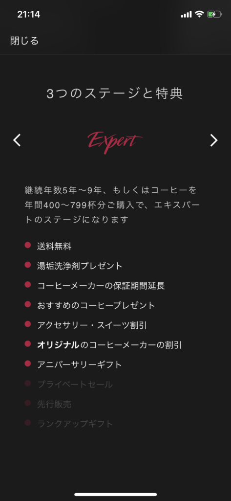 エキスパートステージになるとコノサーステージのサービスに加え、アクセサリーの割引(グラス、カップなどが20%引きで購入可能)、コーヒープレゼント(400杯購入事に10杯分プレゼント)、あとはアニバーサリーギフト(何なのかわ不明(笑))のサービスが追加。