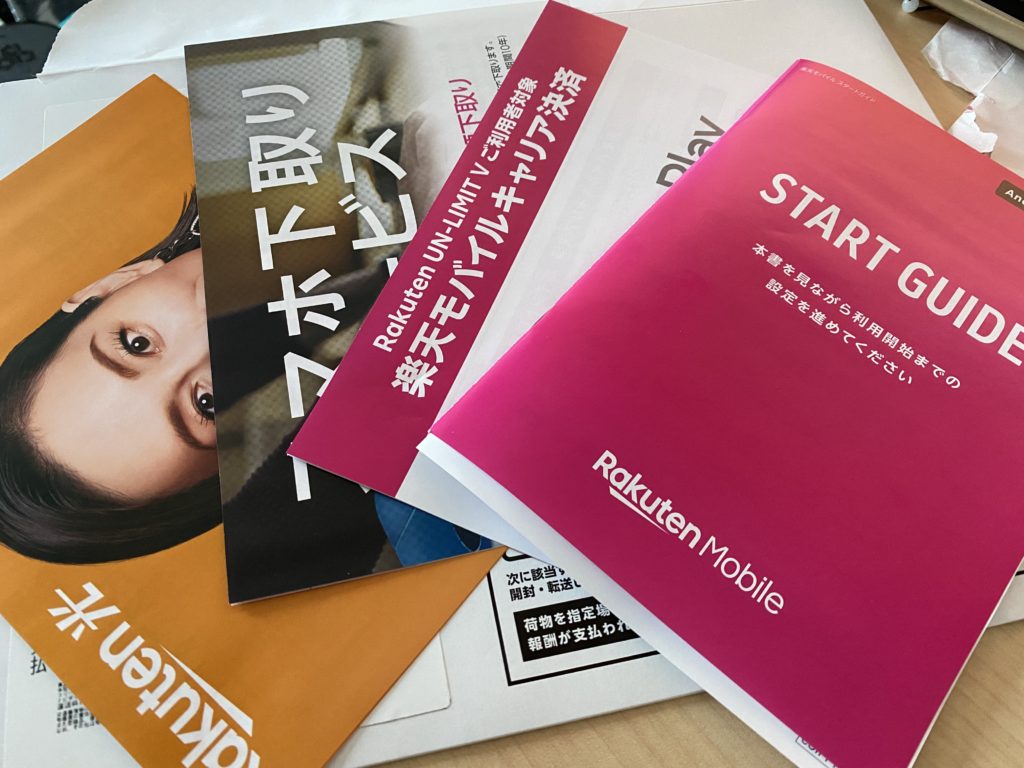 申し込みをしてから2日か3日で下の冊子が入った封筒が届いたわ!中身は初期設定マニュアルと、楽天光とかのチラシ。アタシの場合eSIMを選択したからSIMカードもナシ!