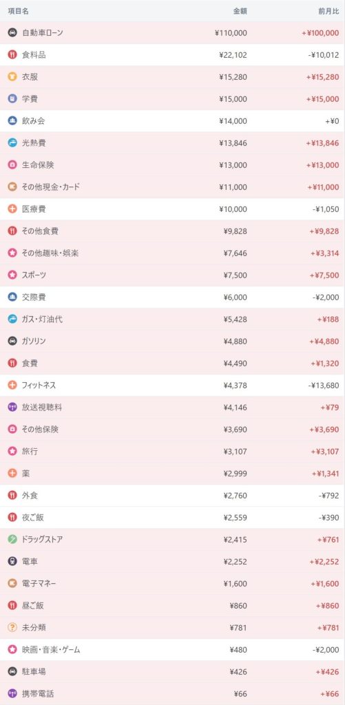 自動車ローンの繰り上げ返済分赤字ってところかな・・。それを除いても収支±0でやっぱり今月は支出が多かったわ・・(泣)