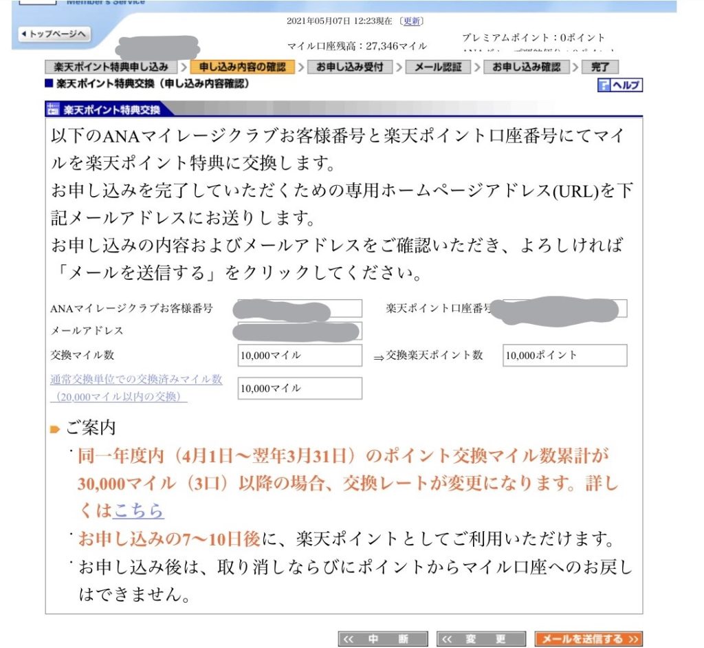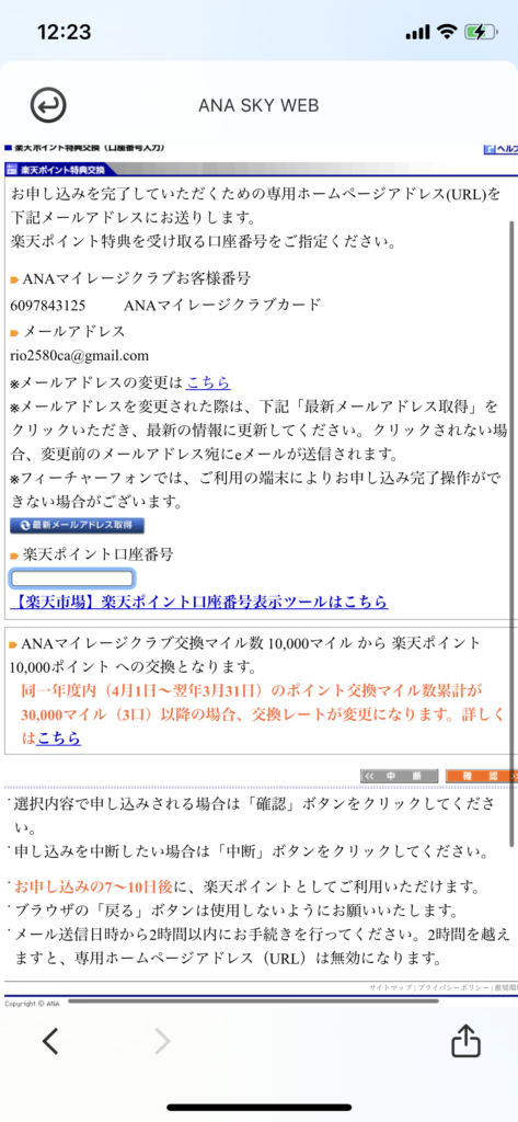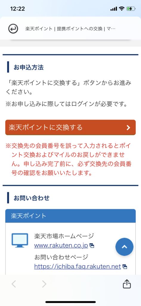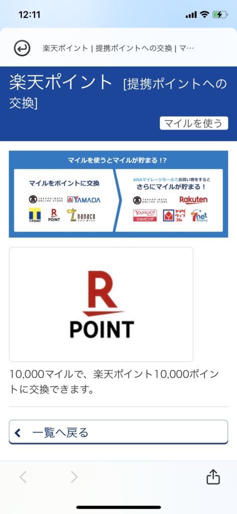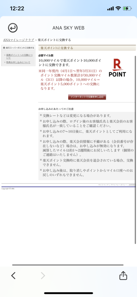 楽天ポイントへの移行は10000マイルから。(1マイル=1楽天P)