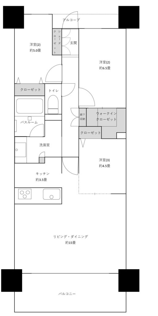 コチラがアタシが購入したマンションの間取り。HPに載ってる間取り図をそのまま載せちゃうと物件特定される可能性あるから、今回載せてる間取り図はアタシがエクセルを駆使して作った間取り図なのはご承知を♪横長リビングタイプでリビングダイニングで15畳ほど。奥まった位置に洋室(3)が配置されてて、スライドドアを開けばリビングダイニングを一体化できるようになってるのがお気に入りポイントね~。 総じて、よくある板状マンションの‘3LDK田の字レイアウトの間取りって感じ。