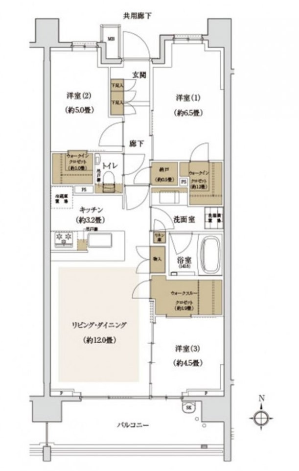 | メリット | リビング窓からキッチン・リビング・ダイニングまでの距離が近く採光が取れるため、キッチンも明るい | 洋室(3)にも窓があるため採光が取れ明るい |