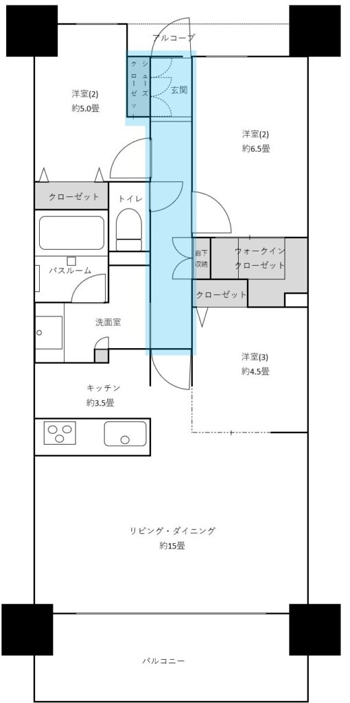 内覧会その②は共用廊下側に面した洋室1と2。(下の間取り図の色を洋室1,2につけたかったんだけど、スマホじゃ無理(泣))